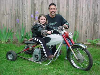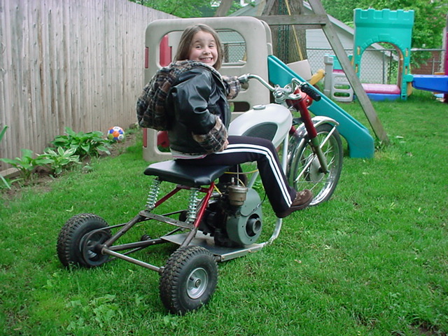 by John Misita, 2011 Below are pictures of what was left of my 1966 Bridgestone 90 sport, after the oil injection system FAILED! Cruising at 50 MPH the engine suddenly locked solid and I came to a screeching halt. Walking 2.5 miles home pushing this dead horse, my thought was to fix it, but as life would have it the young lady in the photo was born and the bike sat forgotten. This was in 2004, my daughter wanted one of those battery powered Barbie jeeps. What we created was a combination Bridgestone/go-cart/1940's model N Briggs and Stratton engine with forward-reverse gearbox. This is in fond memory of the best little street bike I ever owned, living on as a sick twisted toy straight out of Sid's back yard in Toy Story. |