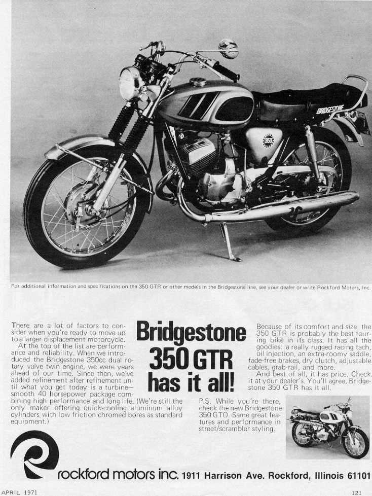 time Bridgestone, 350GTO advertisement, April 1970 Cycle World